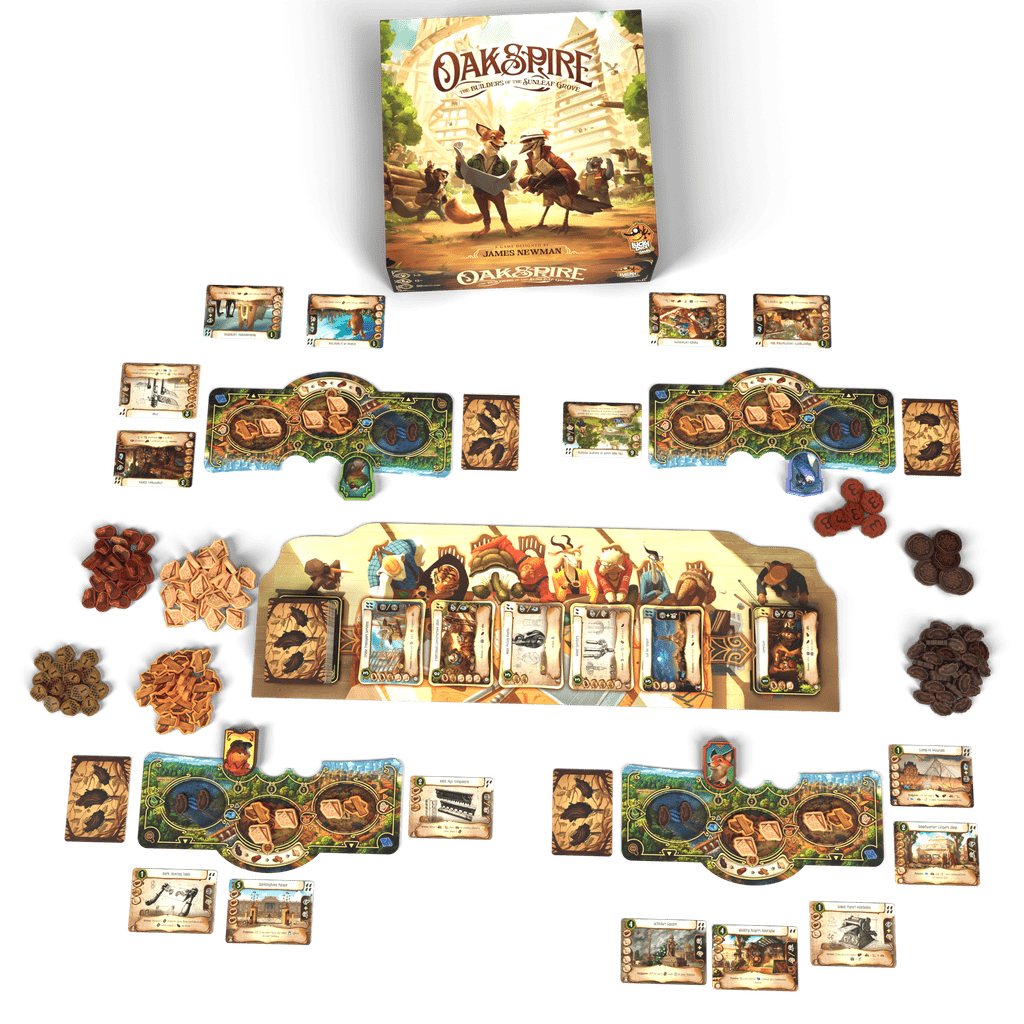 În Oakspire: The Builders of the Sunleaf Grove, jucătorii preiau rolurile unor arhitecți ai pădurii, având sarcina de a planifica proiecte, de a organiza linii de aprovizionare și de a prelucra lemnul pentru a construi structuri sustenabile în Sunleaf Grove. Mecanica principală se bazează pe utilizarea cărților de proiect cu întrebuințări multiple, prin care participanții pot colecta resurse, executa acțiuni, îmbunătăți materialele sau crea planuri pentru noi clădiri în propriul tablou. Fiecare tur permite efectuarea a trei acțiuni, printre care se numără plasarea planurilor, căutarea lemnului și diverse acțiuni de companie, precum colectarea, procesarea sau transportul materialelor.